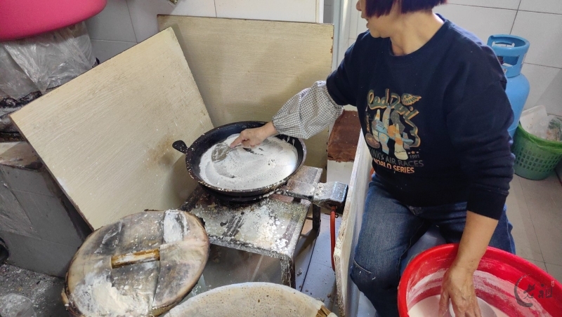 以前用“涂炭”炉烙粿汁皮需要对火候的把握比较精准,现在改用煤气炉了就比较好控制,烙出来的粿汁皮受热更均匀,口感也更好。