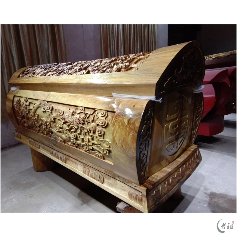 做工厚重:潮汕棺材的做工非常扎实,板材厚重,结构紧密,给人一种沉稳、坚固的感觉,体现了子女对父母“身后住所”的重视。