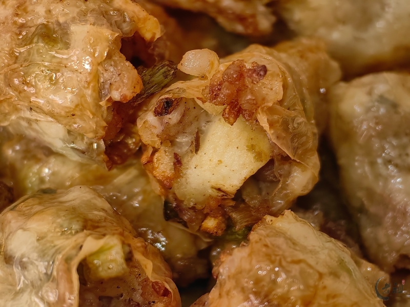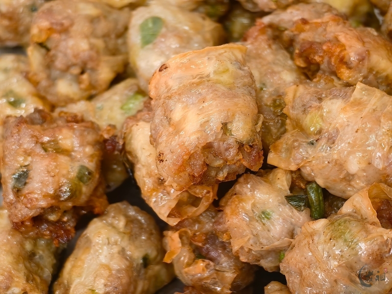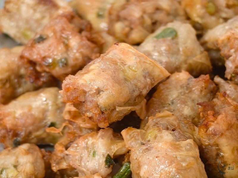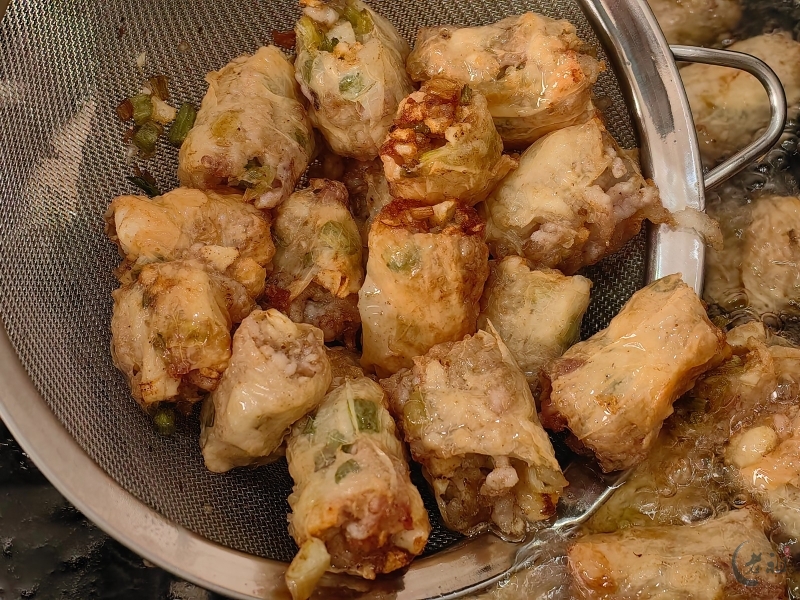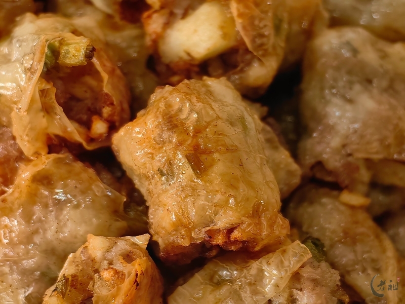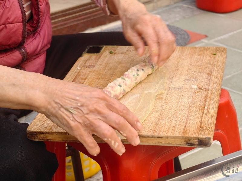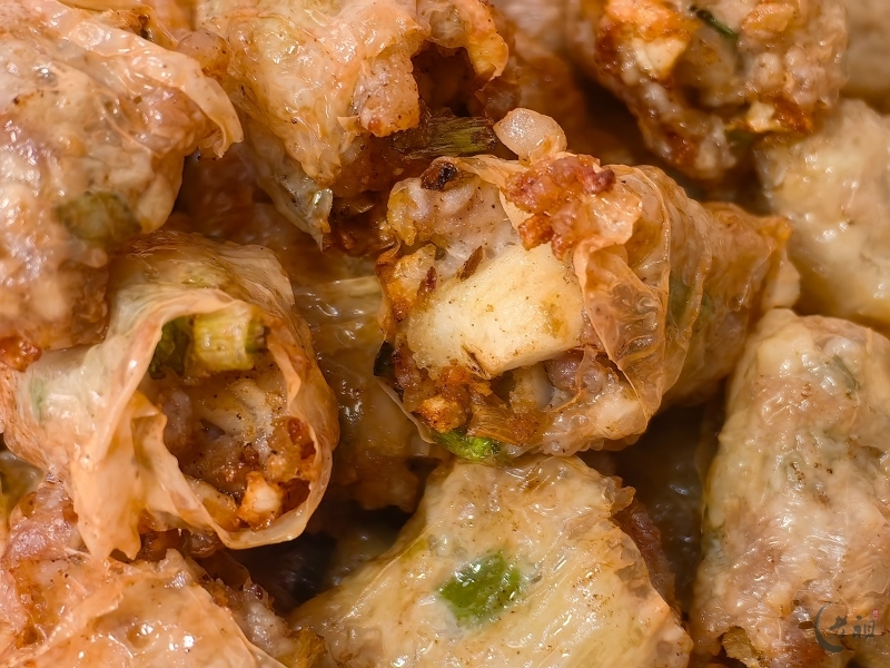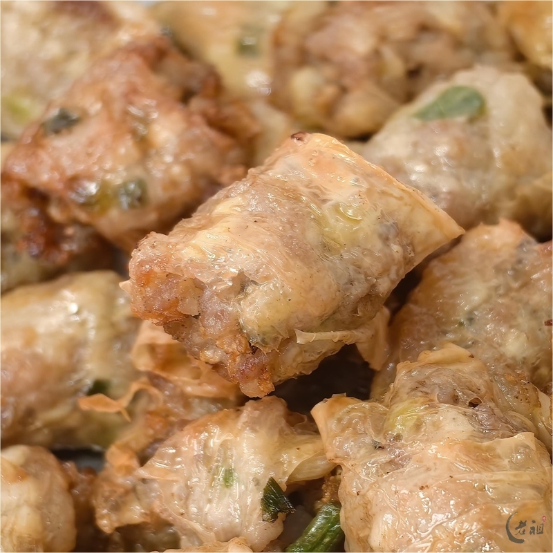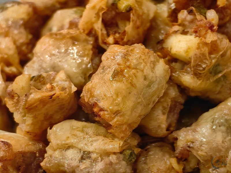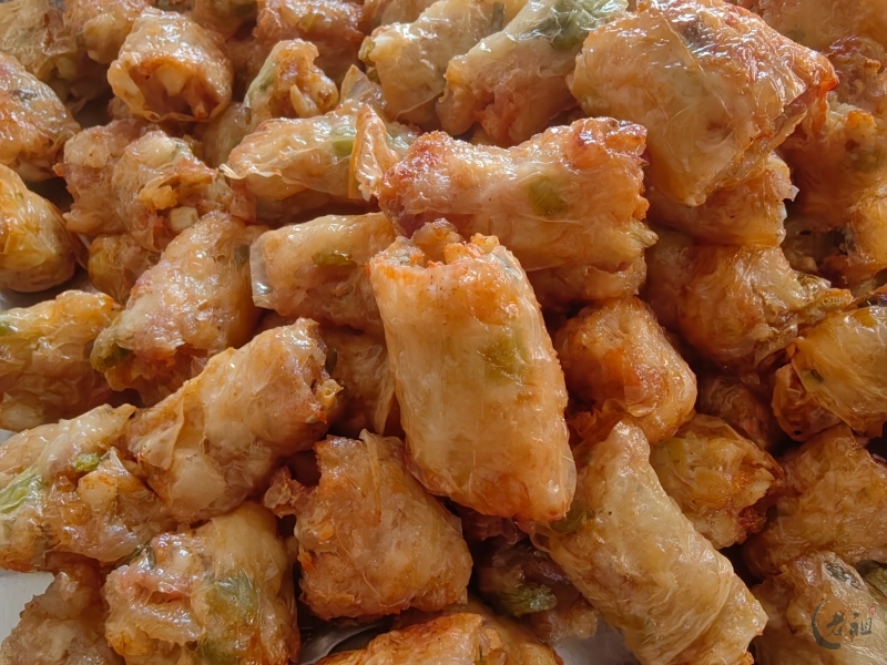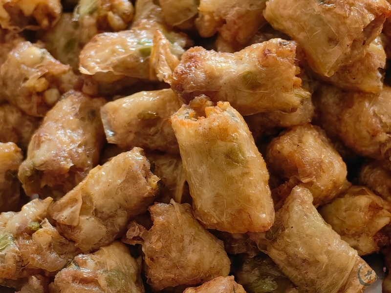 特别是在过年期间,粿肉用腐膜将丰富的馅料包裹起来,油炸成金黄色的长条,再切块,有着“把所有好东西卷起来”的美好寓意,象征着来年家运兴旺、财源广进。