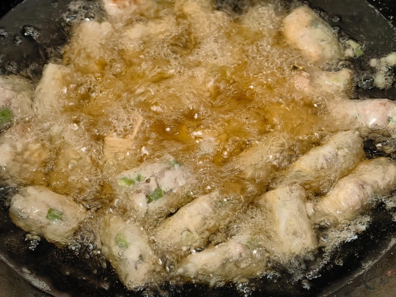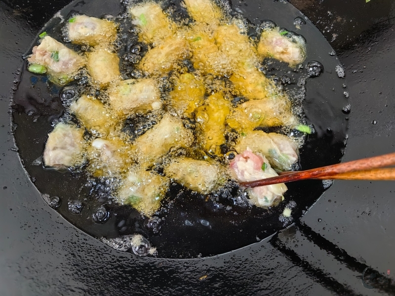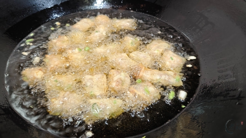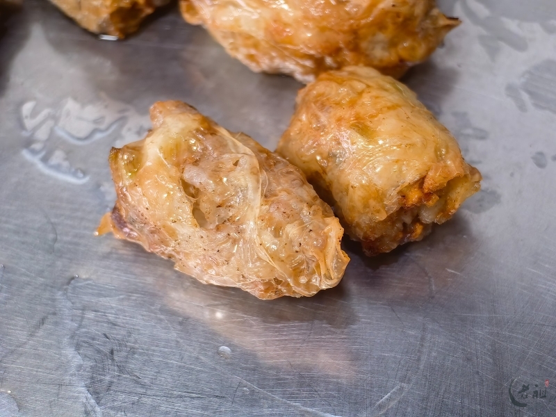 熟制工序更为复杂。用猪网油卷好馅料后,还要在外层扑上生粉,晾干或速冻一下以便切块。切好的小块需要沾上粉浆(由鸡蛋、面粉、卤粉、盐调制)再入锅油炸,通常还要复炸一遍以保证酥脆。