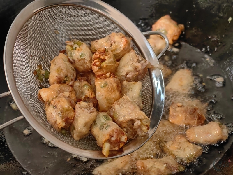 用筷子夹起飘着油炸香气的金黄小段,蘸上特制的桔油或桔酱,送入口中,酸甜可口的桔油或桔酱味先将味蕾唤醒,随之而至的便是香脆的豆腐皮香以及嫩滑的鲜香肉味,慢慢咀嚼,同时还能感受到小块马蹄的爽口和清甜。皮薄香脆,馅鲜饱满,让你余味无穷。