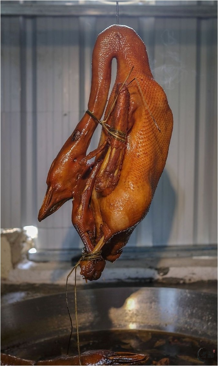 第三吊,最后一次把整鹅吊起,此时,浓香四溢、醇美金黄、色泽诱人的卤鹅便制作完成了。