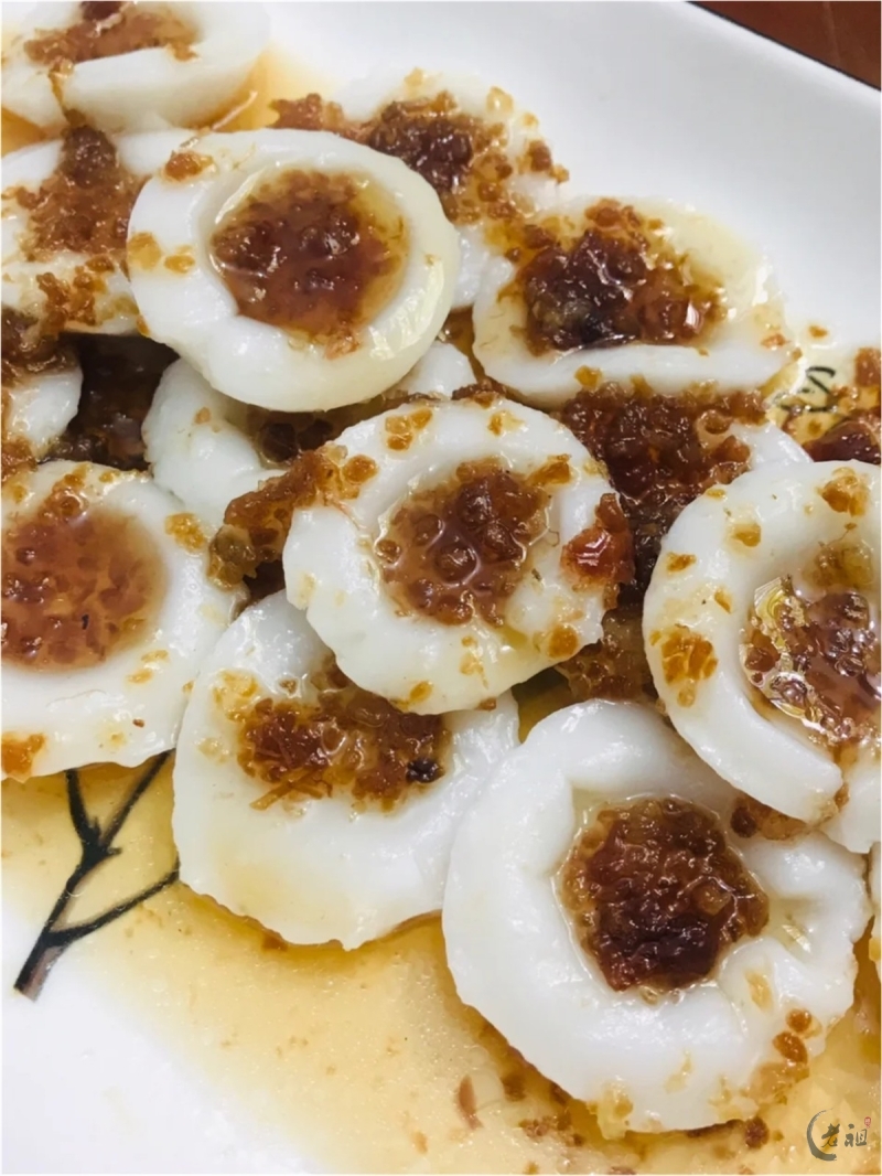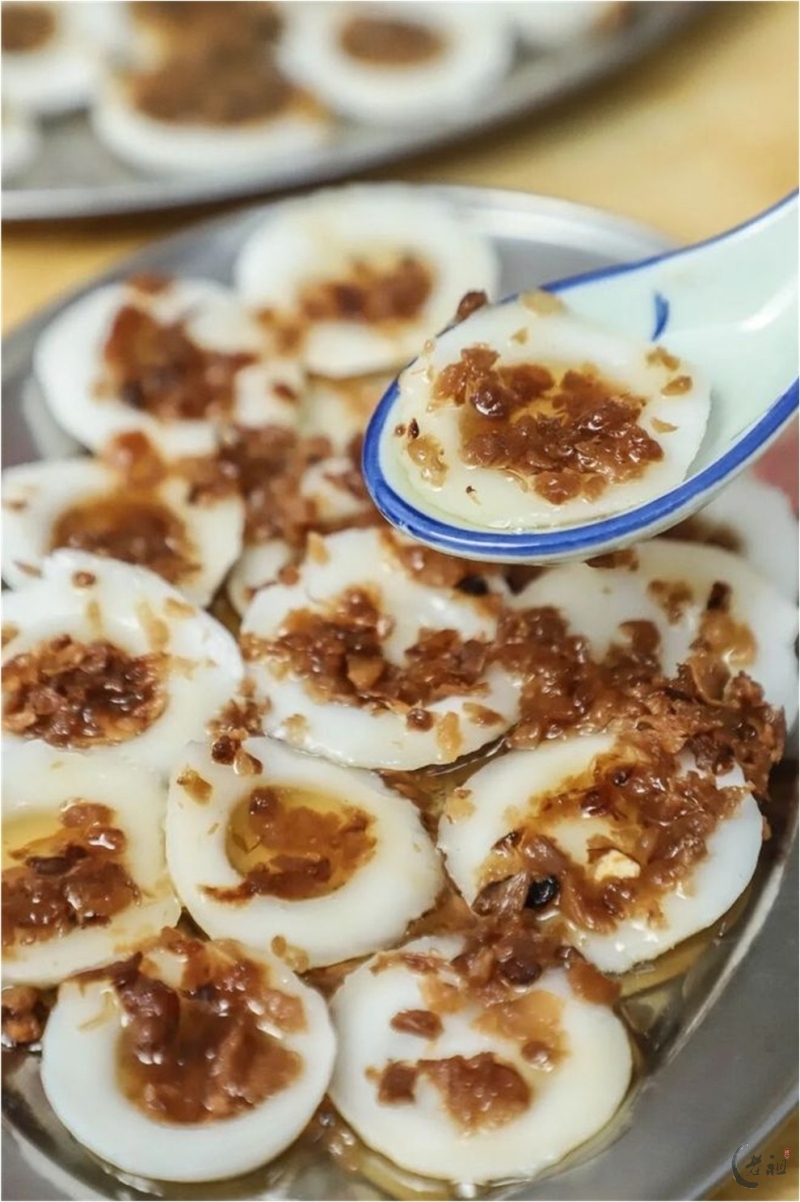 蒸熟的水粿从模具中取出,一个个码在盘子里,洁白晶莹,微微颤动,像刚出水的白玉。这时候,还只是半成品。真正让水粿活色生香的,是最后那道点睛之笔——浇上炒香的菜脯粒和甜酱。
