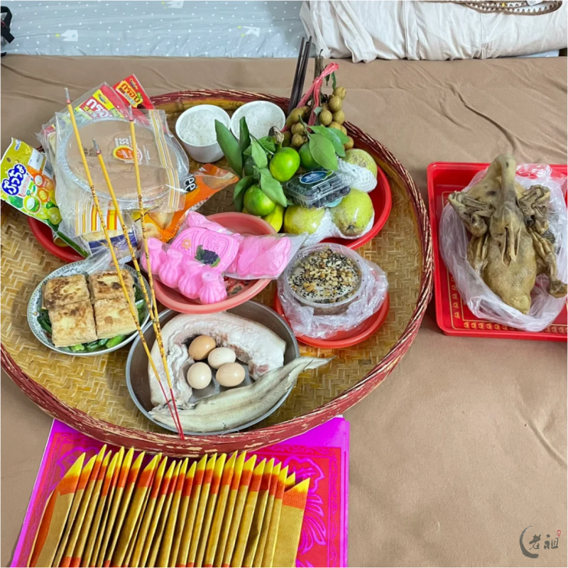 祭拜“公婆母”的地点不是在厅堂里,而是在睡房的眠床上。祭拜时眠床的草席上面放上一个过节时盛棵用的大竹绳子,摆上乌鱼、龙眼、薯粉制的小甜圆、粉丝、鸡蛋等象征吉祥、多子、长寿、圆满的供品,点上“公婆灯”,用瓷碗或竹筒作香炉。
