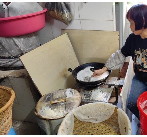 以前用“涂炭”炉烙粿汁皮需要对火候的把握比较精准,现在改用煤气炉了就比较好控制,烙出来的粿汁皮受热更均匀,口感也更好。