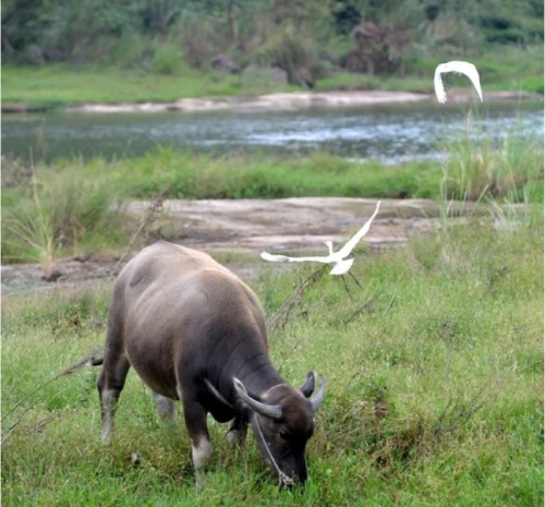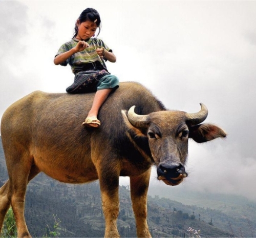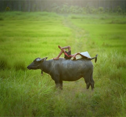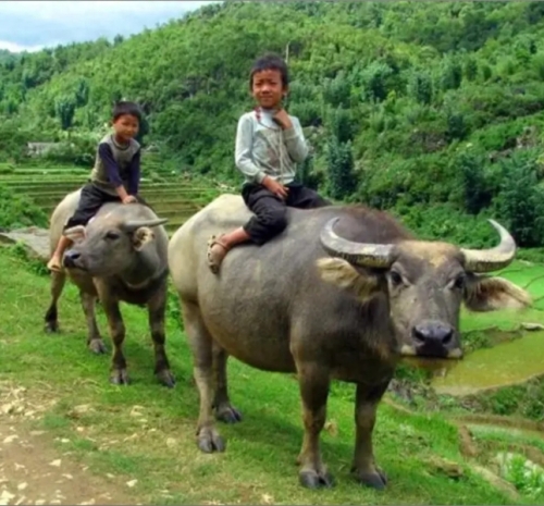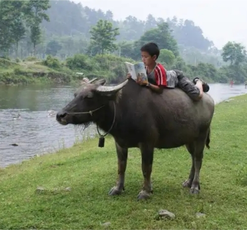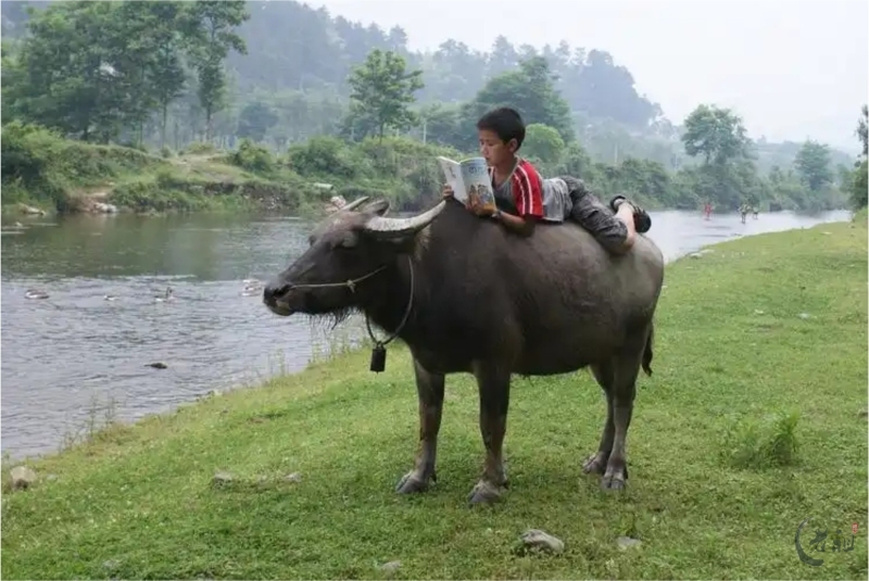 对于土生土长的乡村孩子而言,放牛则是童年必修的功课。任务通常落在稍年长的孩子身上,他们接过父辈手中的牛绳,也接过了对家庭生产的责任。放牛的时间自有其韵律:清晨露水未干时出牧,让牛在劳作前饱餐一顿;傍晚则赶在日落前,将吃得肚子滚圆的牛儿牵回。地点多在村外的河滩、山坡、田埂,或是收割后的闲田。水牛喜水,炎热时必要赶到水塘或小溪中浸泡,只见其“皮毛冒着青光”,惬意地浮在水中,只露出鼻孔和弯角。