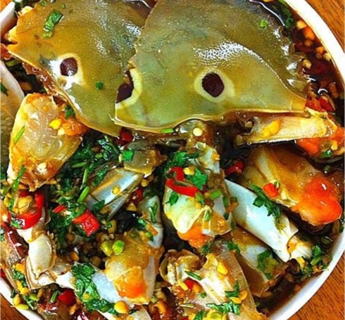 制作方法:在一个干净的大碗中,将生抽、白糖、鱼露混合搅拌至糖融化。蒜末和高度白酒是杀菌的关键,务必足量。 将大部分蒜末、姜片、辣椒圈加入酱油汁中,留下少许蒜末和全部香菜叶备用。