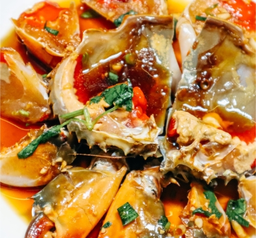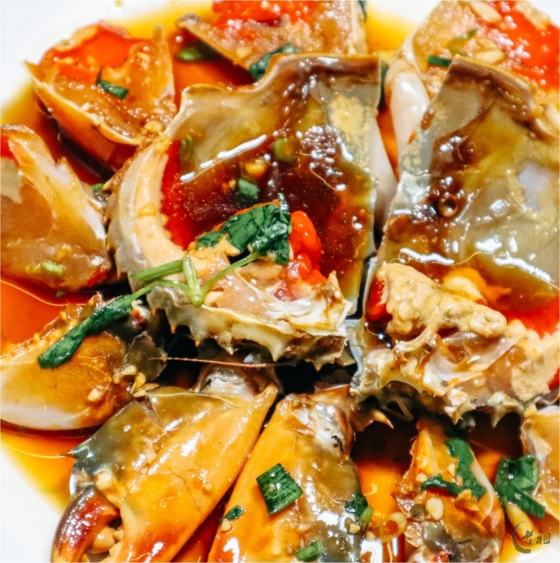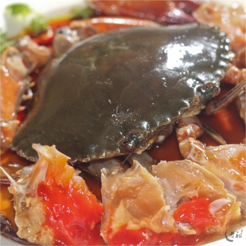 选蟹:必须选用活蹦乱跳、膏体饱满坚实的母青蟹(锯缘青蟹)。以蟹壳墨绿发亮、蟹脚坚硬、腹部饱满微红为上。任何活力不足者均不可用。