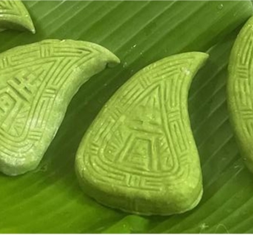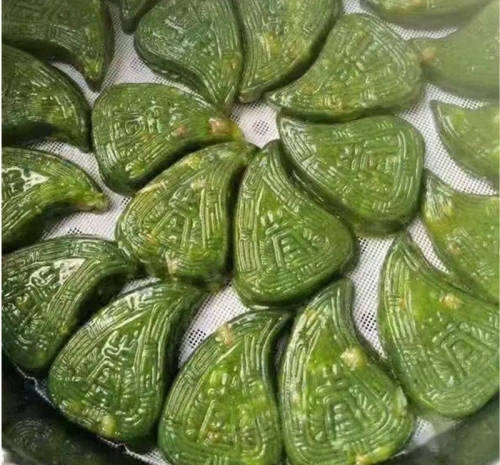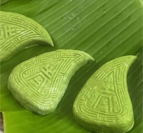 馅料备好,粿皮揉妥,便到了最显手艺的环节。揪一团乌亮的粉团,在掌心搓圆、捏薄,形成一个柔软的小碗。填入馅料,轻轻收口,然后放入雕刻着福禄寿花纹的桃形木印模中,压实、脱模。一个带着吉祥纹路的鼠壳粿便诞生了。