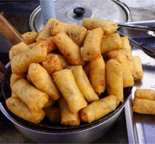 第四步,控温。炸的过程中要注意控制油温,不能太高,否则外皮焦了里面还没熟;也不能太低,否则春卷会吸油变得油腻。始终保持中小火,让热量慢慢渗透进去,把里面的馅料也炸透。